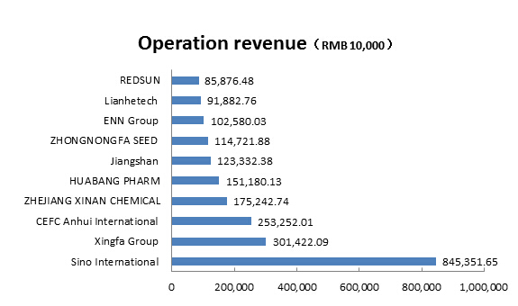 The ranking of operation revenue: Sinochem International’s operation revenue in the first quarter reaches RMB 8.454 billion, which ranks No.1. The operation revenue of XINGFA GROUP and CEFC Anhui International are RMB 3.014 billion and RMB 2.533 billion, ranking No.2 and No.3. respectively.