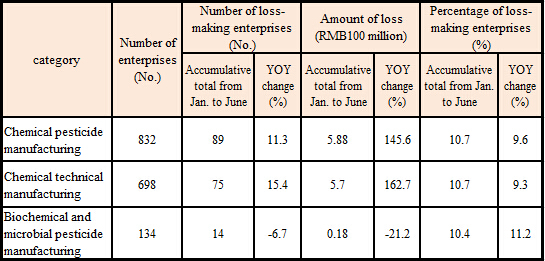 In the first half of 2015, despite strong growth in overall profit, the number of loss-making enterprises grew 11.3% year on year, with an amount of loss of RMB588 million, a big year-on-year increase of 145.6%; and the percentage of loss-making enterprises increased by 1.1 percentage point year on year. The number of loss-making enterprises, the amount of loss and the percentage of loss-making enterprises of chemical technical manufacturing enterprises all increased significantly year on year, while those of biochemical and microbial pesticide manufacturing enterprises all decreased relatively.