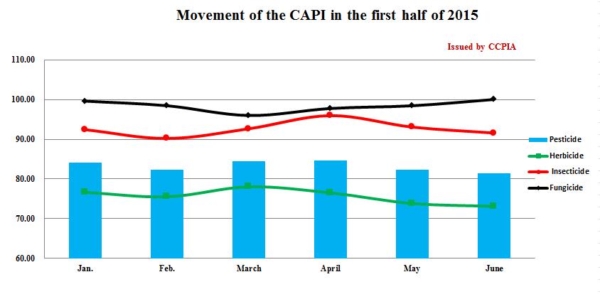 The movement of the CAPI in the first half of the year is as shown in Figure 1 below. From the figure we can see that the CAPI of herbicides fluctuated between 73.0-79.0, maintaining at the lowest level among other pesticide varieties and reaching the lowest level in June at 73.10, a month-on-month fall of 1.00% and a year-on-year fall of 26.50%. Except glyphosate, the transaction prices of the technical of many herbicides such as 2,4-D, paraquat, acetochlor and atrazine fell. In the high temperature period and slack season, the business of the herbicide market is slack, the demand is weak and the prices are on an obvious falling trend. The herbicide market is expected to maintain at a low level for some time in future. Figure 1 Movement of the CAPI in the first half of 2015