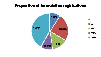 According to the statistics of the MOA, the number of pesticides registered in China in 2012 and 2013 both remained more than 3,000 per year, but it fell slightly in 2014. In 2014, 3,370 products were registered, down 1.6% year on year (YoY), of which there were 3,082 field pesticides, down 1.1% YoY, and 288 household pesticides, down 7.1% YoY. 2,952 were under official registration and 418 under temporary registration. Official registration accounted for 87%, basically the same as last year.