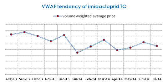 According to CCPIA monthly bulletin of statistics of China pesticides, market of imidacloprid TC performed not well in July. Volume weighted average price of imidacloprid TC declined by $950 per tonne, meanwhile with two less manufacturers operating, output of imidacloprid TC declined by 36.7% and sales volume dipped by 33.6% MoM. Actually since the beginning of 2014, market of imidacloprid TC has been in a depress atmosphere. Quoted price of main manufacturers kept declining and there’s no sign indicate that the future market will bottom out.