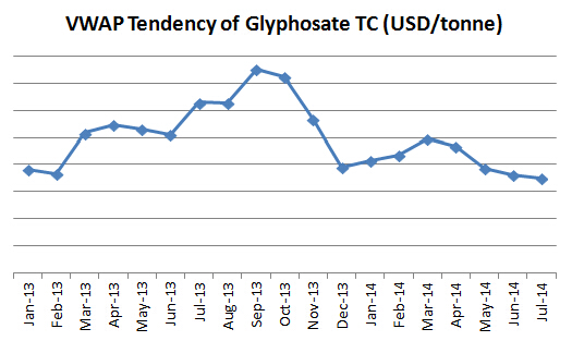 According to CCPIA monthly bulletin of statistics of China pesticides, in July, resulted from some long-term orders’ continuous impact, VWAP of glyphosate TC declined by $70 per tonne than that of June, however the month-on-month drop was smaller than that of June.