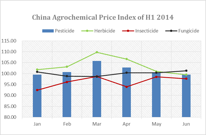 The CAPI of fungicides of June was 101.31, hitting a record high of the first half of the year with an increase of 0.92% compared to last month, a drop of 4.10% compared to last June and an increase of 2.68% compared to the lowest price index of March. Among these three categories of agrochemical products, the fungicides account for the smallest market share. Fungicide manufacturers are relatively stable and the market supply and demand of fungicides remains relatively steady, so the market expectation of fungicides is predictable. During the first half of the year, the change range of CAPI of fungicides on the whole is relatively small, falling to between 98.63 and 101.31.
