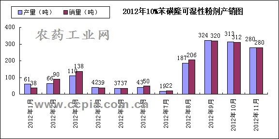 以下为10%苯磺隆可湿性粉剂2012年1-11月产量和销量趋势图: