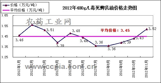 据农药工业网数据统计,480克/升毒死蜱乳油2012年11月价格为3.52万元/吨,较10月环比上涨2.6%,较去年同期同比上涨2.6%。从今年的价格走势来看,价格最高点为今年2月,价格为3.56万元/吨,最低点为今年7月,价格为3.36万元/吨。