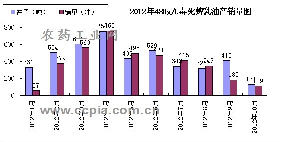 以下为480克/升毒死蜱乳油2012年1-10月产量和销量趋势图: