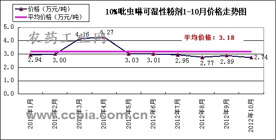 据农药工业网数据统计,10%吡虫啉可湿性粉剂2012年10月价格为2.74万元/吨,环比下降5.2%,同比下降7.1%。从2012年的价格走势来看,价格最高点为4月,价格为4.27万元/吨,最低点为10月,价格为2.74万元/吨。2012年1-10月10%吡虫啉可湿性粉剂平均价格为3.18万元/吨。从4月以来,10%吡虫啉可湿性粉剂价格一路下行,目前为今年来的最低点。