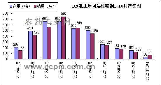 2012年10月份10%吡虫啉可湿性粉剂产量为38吨,环比下降75.0%,同比下降75.6%;销量为78吨,环比下降39.5%,同比下降54.9%。从趋势图上来看,10%吡虫啉可湿性粉剂产销量一直比较均衡,产销主要集中在2月到6月。6月之后,产销量下降明显,10月份为今年产销最低点。