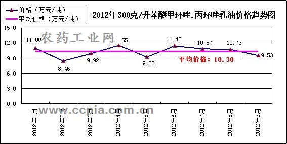 据农药工业网数据统计,300克/升苯醚甲环唑.丙环唑乳油2012年9月价格为9.53万元/吨,较8月环比下降11.2%。从今年的价格走势来看,价格最高点为今年4月,价格为11.55万元/吨,最低点为2月,价格为8.46万元/吨,价格有所回落。