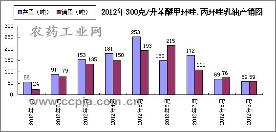 以下为300克/升苯醚甲环唑.丙环唑乳油2012年1-9月产量和销量趋势图: