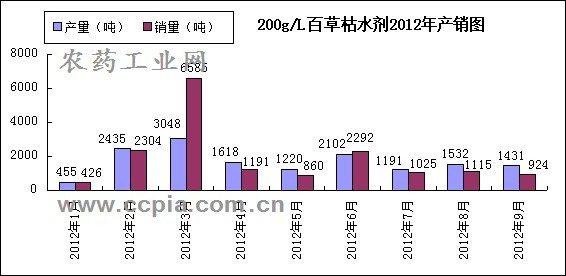 以下为200克/升百草枯水剂2012年1-9月产量和销量趋势图: