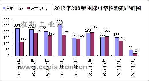 以下为20%啶虫脒可溶性粉剂2012年1-9月产量和销量趋势图: