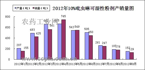 以下为10%吡虫啉可湿性粉剂2012年1-9月产量和销量趋势图: