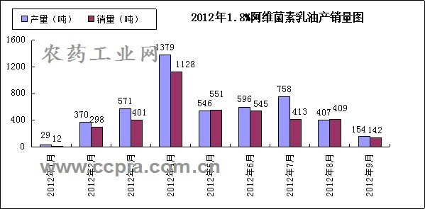 以下为1.8%阿维菌素乳油2012年1-9月产量和销量趋势图: