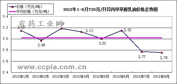 据农药工业网数据统计,2012年1-8月750克/升异丙甲草胺乳油价格趋势如图: