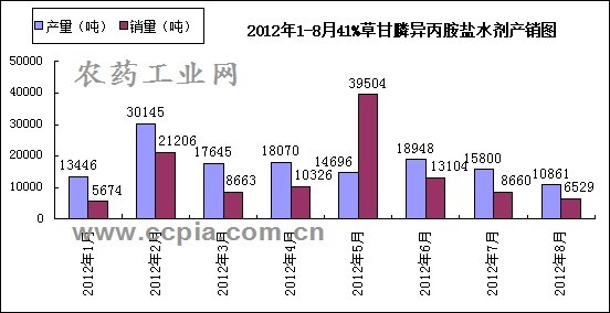 今年8月份41%草甘膦异丙胺盐水剂产量为10861吨,较7月环比下降31.3%,较去年7月同比增加16.9%;销量为8660吨,环比下降24.6%,同比下降44.6%。由此可见,41%草甘膦异丙胺盐水剂8月份产销量与上月相比大大下降,产量同比增加但是销量同比明显下降。