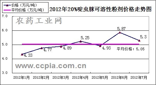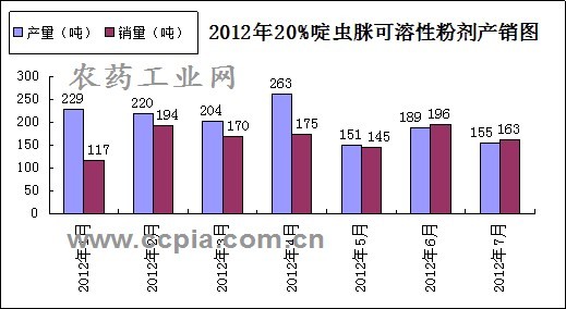 今年7月份20%啶虫脒可溶性粉剂产量为155吨,较6月环比下降18.0%,较去年7月同比增加49%;销量为163吨,环比下降16.8%,同比增加79.1%。由此可见,20%啶虫脒可溶性粉剂7月份产销量与上月相比有一定下降,而与去年同期相比则产销量都大增。