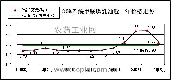 据农药工业网数据,30%乙酰甲胺磷乳油2012年5月价格为2.11万元/吨,环比下降21.3%,同比上涨24.1%。从近一年的价格走势来看,价格最高点为今年4月,价格为2.68万元/吨,最低点为去年9、10和11月,价格为1.69万元/吨。