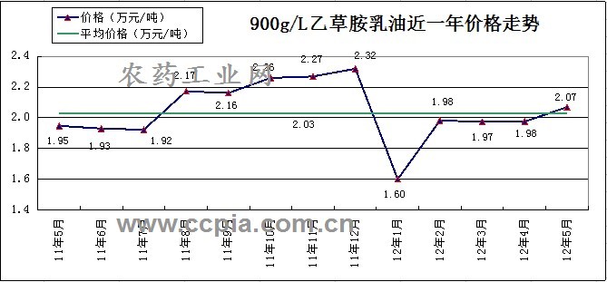 据农药工业网数据统计,900g/L乙草胺乳油2012年5月价格为2.07万元/吨,较4月环比上涨4.5%,较去年5月同比上涨6.2%。从近一年的价格走势来看,价格最高点为去年11月,价格为2.32万元/吨,最低点为今年1月,价格为1.60万元/吨。