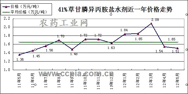 41%草甘膦异丙胺盐水剂2012年5月价格为1.51万元/吨,较4月环比下降1.9%,较去年同期同比上涨11.0%。从近一年的价格走势来看,价格最高点为今年3月,价格为2.09万元/吨,最低点为去年5月,价格为1.36万元/吨。