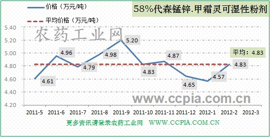 58%代森锰锌.甲霜灵可湿性粉剂2月份均价4.83万元/吨,有所上扬。据中国农药工业网数据统计,该产品2月份国内销量为171吨,本月产量约为193吨,产销两旺。具体走势如图: