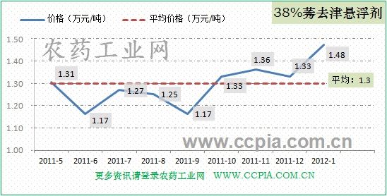 38%莠去津悬浮剂开春价格有所上升,1月份均价在1.48万元/吨,而近半年的平均价格为1.3万元/吨,走势图如图。