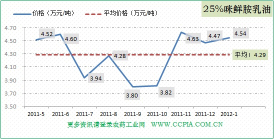 25%咪鲜胺乳油1月份均价:4.54万元/吨,各企业之间报价差别大,造成该产品价格波动较大,近半年来的平均价格为4.29万元/吨,具体价格走势如图。