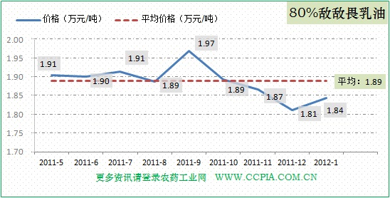 80%敌敌畏乳油近半年平均价格在1.89万元/吨,1月份价位偏低,在1.84万元/吨左右,具体走势图如下。