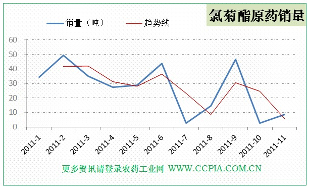 【农药工业网】氯菊酯原药主要生产企业2011年11月份销售8.63吨(折百量),2011年10月份销售为2.80吨(折百量)。2011年1-10月份累计销售294.08吨(折百量)。