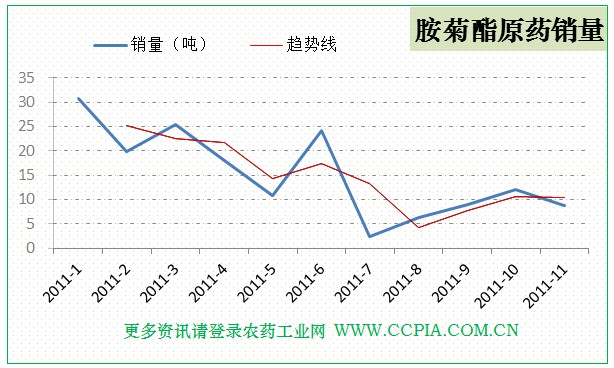 【农药工业网】胺菊酯原药2011年11月份销售为8.79吨(折百量),2011年10月份销售为12.04吨(折百量),环比减少27.00%。2011年1-11月份累计销售167.21吨(折百量)。