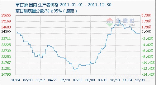 如图所示,11年草甘膦原药的均价基本在23000元/吨左右。特别是后半年,随着国内草甘膦出口退税政策取消和人民币升值,导致部分企业出口压力增加,部分原药厂家降低了开工率,原药库存较少。加之国内一些自然灾害,导致原料黄磷的价格迅速上涨,致使草甘膦原药价格后半年有一个明显上升的趋势。但是草甘膦制剂产品的价格,市场价格拼杀激烈,使厂家只能靠降低利润来维持草甘膦制剂的销售价格,保持市场占有率,这种方式对于草甘膦制剂生产企业来讲实在是无奈之举,微薄的利润在刨掉销售费用后甚至入不敷出,但又不舍得放弃,正如鸡肋,“食之无味,弃之可惜”。企业要想发展,必须要有利润做保障,因此,草甘膦制剂厂家只有一条路可走,就是提高毛利,只做高端!怎么来做?是摆在我们面前的最大难题。
