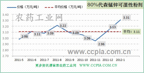 80%代森锰锌可湿性粉剂主要用于蔬菜、果树、棉花、苗木等作物上的各种生育期的炭疽病、早疫病等多种病害的防治。1月份均价为3.31万元/吨,比前一阶段有所上扬。自2011年5月至今,80%代森锰锌可湿性粉剂平均价位为3.11万元/吨。
